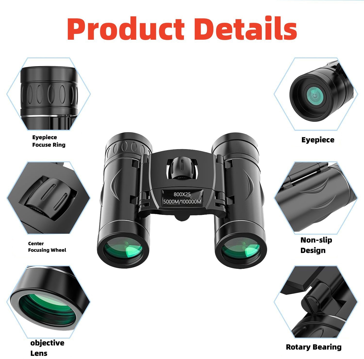 - 800X COMPACT BINOCULARS - Our binoculars are high powered with 800x magnification zoom and a 25mm large field of view, letting you observe and focus on the target in great detail . It's ideal binoculars for adults and kids, bird watching, hunting, camping, climbing, hiking, safari, travel, opera, concert, and sports events.