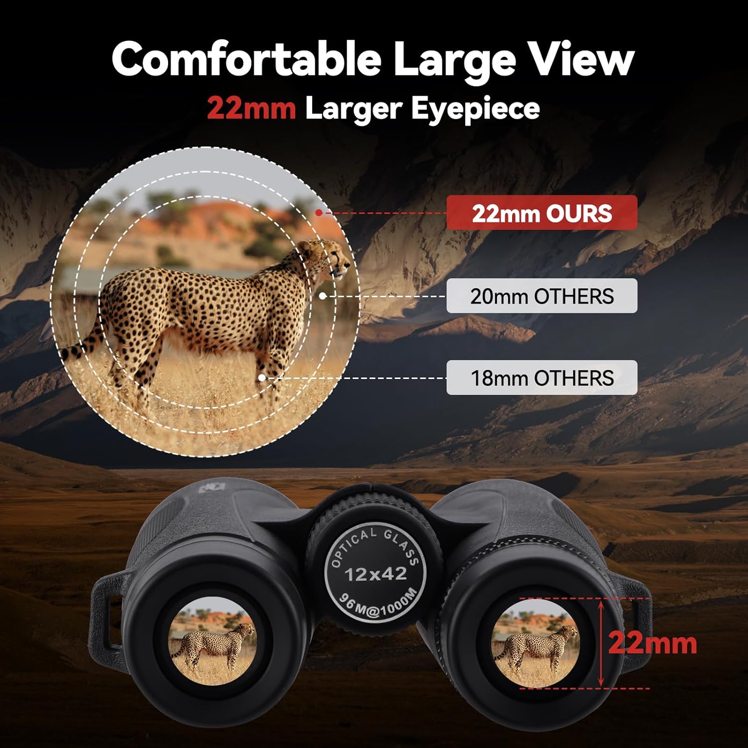 - ๐๐ง๐ก๐๐ง๐๐๐ ๐2๐ฆ๐ฆ ๐๐ฒ๐๐ฉ๐ข๐๐๐: With an expanded 22mm eyepiece, these binoculars offer a field of view 1.5 times larger than 16mm models, delivering a clearer and larger image. The larger eyepiece fully utilizes 12x magnification, ensuring sharper, more detailed visuals for a richer experience in the great outdoors