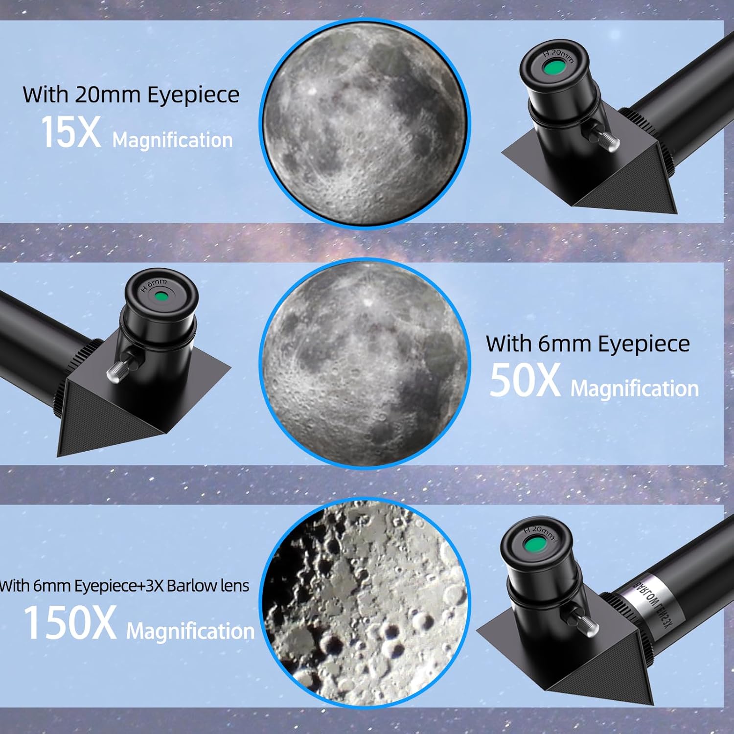 - 【HIGH MAGNIFICATION 】- Equipped with 2 eyepieces(H20mm and H6mm) and a 3X Barlow lens. The 3x Barlow lens trebles the magnifying power of each eyepiece, so kids can get magnification from 15X to 150X. Whether it's viewing planets or moon, our telescope is the best helper for adults & kids.